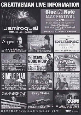 Note: Text and graphics on both sides of flyer, both sides shown. Reverse side promotes other artists coming to Japan: Jamiroquai, Donald Fagen & The Nightflyers, Kamasi Washington, Juju with Takuya Kuroda Band, Asgeir, Lianne La Havas, Dream Theater, Thurston Moore Group, Simple Plan, At The Drive In, Cashmere Cat, Harry Styles, Helloween, Erykah Badu, De La Soul, The Vamps, HYUKOH.
