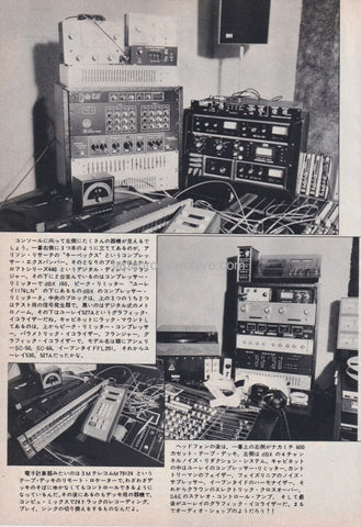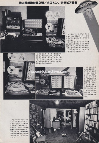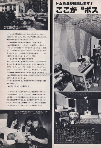 Note: Complete 8 page 23 pic article / photo feature. (4 separate pages, 8 page sides). Japanese text. Tom Scholtz at his underground home studio, mostly all pics of his studio equipment and gear. Photos exclusive to magazine.
