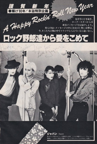 Note: Complete page, photo with (reproduced) signed New Year's message from artist/band member. 1 page, David Bowie on one side, Japan on the other side.