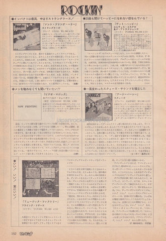 Note: Complete magazine page. Record reviews on both sides of the page, both sides shown. Japanese text . Record reviews of the following albums: Nina Hagen / Unbehagen, The Stranglers / Don't Bring Harry, Elvis Costello & The Attractions / Get Happy, Squeeze / Argybargy, The Flying Lizards / Music Factory