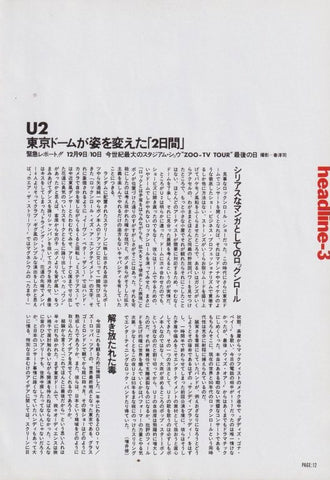 Note: Complete 4 page 2 photo article (3 separate pages, 4 sides). U2 live at Tokyo Dome Dec 9 and 10 1993. Live report with pics. Japanese text.